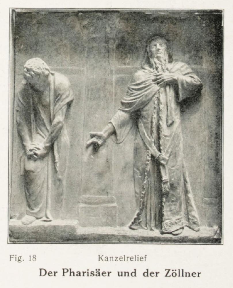 - " Bei den Aussenportalen stehen zwei Kollektenkästen, die, wie auch die übrigen, künstlerisch gestaltet sind. Sie wurden aus vergoldetem Schmiedeeisen gearbeitet und haben Bronzereliefs. Das eine stellt eine alttestamentliche Ährenleserin (Ruth) dar, das andere, nach einer Skizze von Gehrts modelliert, eine Witwe, die mit ihren Kindern um Hilfe fleht. Der Urheber dieser Arbeiten ist Gregor von Bochmann d. J., der den Hautantail an der Ausschmückung der Kreuzkirche hat. "