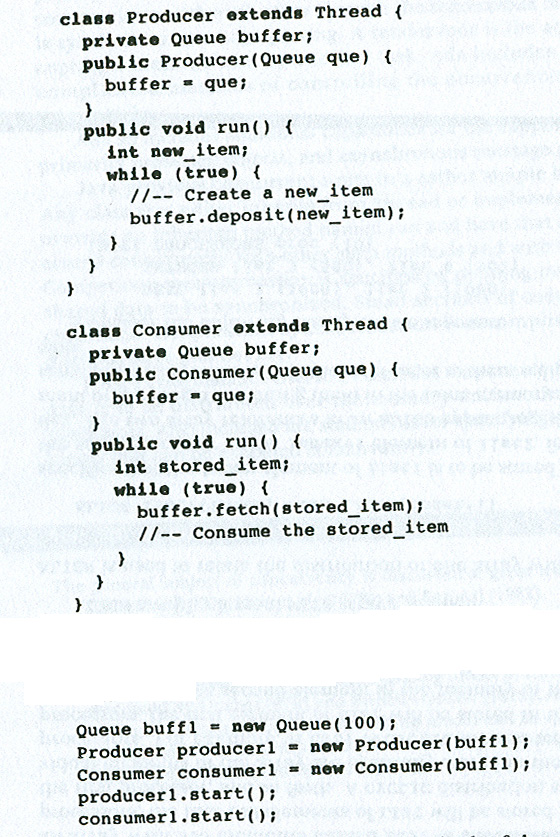 - A FIFO queue with producer and consumer process are given in the book by Sebesta (see copy (a) of the Queue class (note: there is a bug in the incrementation of the pointer variables, such as nextIn) and (b) of the producer and consumer classes that call an instance of Queue. At the end, there is the main program that creates instances of these objects and passes the Queue instance to the producer and consumer when they are constructed.
