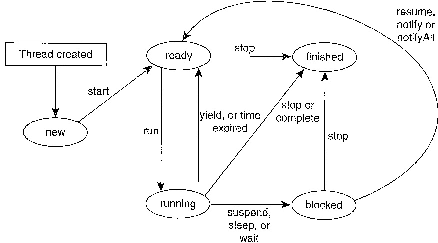 Note that the behavior of a scheduler is not always defined at all levels of details; e.g. for the Thread scheduler in a Java virtual machine, not all aspects are defined. Normally, one distinguishes the following states for a process (thread, task, ...) that is scheduled by the scheduler (see diagram below):