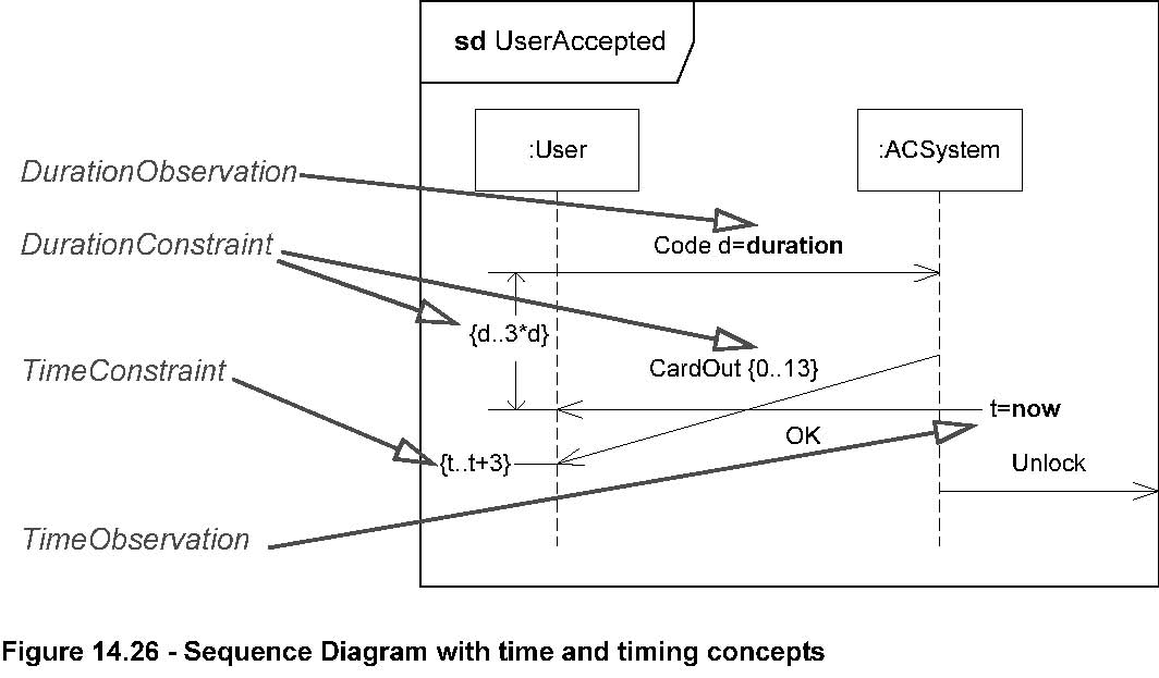 The Sequence Diagram in Figure 14.26 shows how time and timing notation may be applied to describe time observation