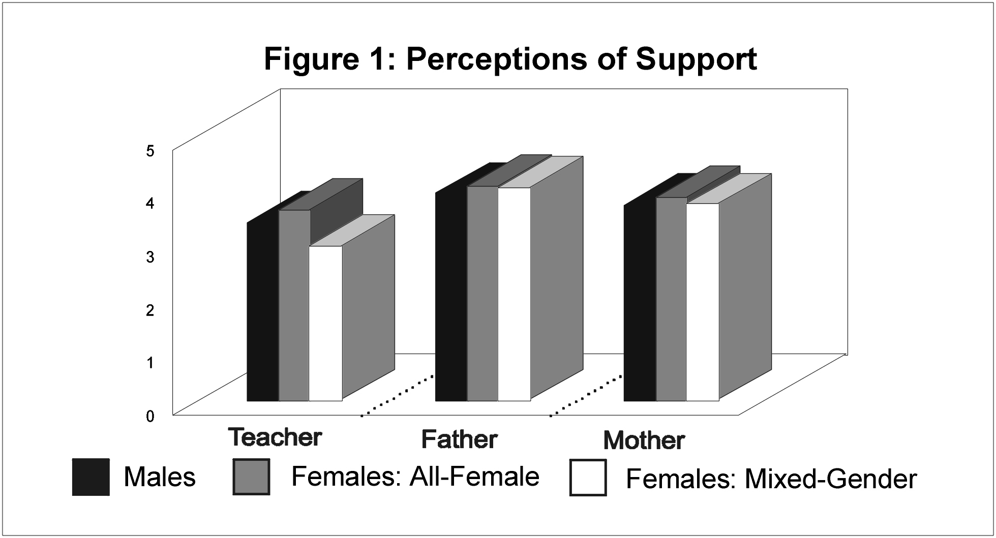 In terms of the students' perceptions of support for their interest in computers, we found a significant group difference for perceived teacher support: girls from the all-female classes and boys reported similar levels of perceived teacher support, whereas girls from the mixed-gender classes reported less perceived support. This result is interesting because the same teachers teach both the all-female and mixed-gender classes. Perceived support from teachers and parents are presented in Figure 1.