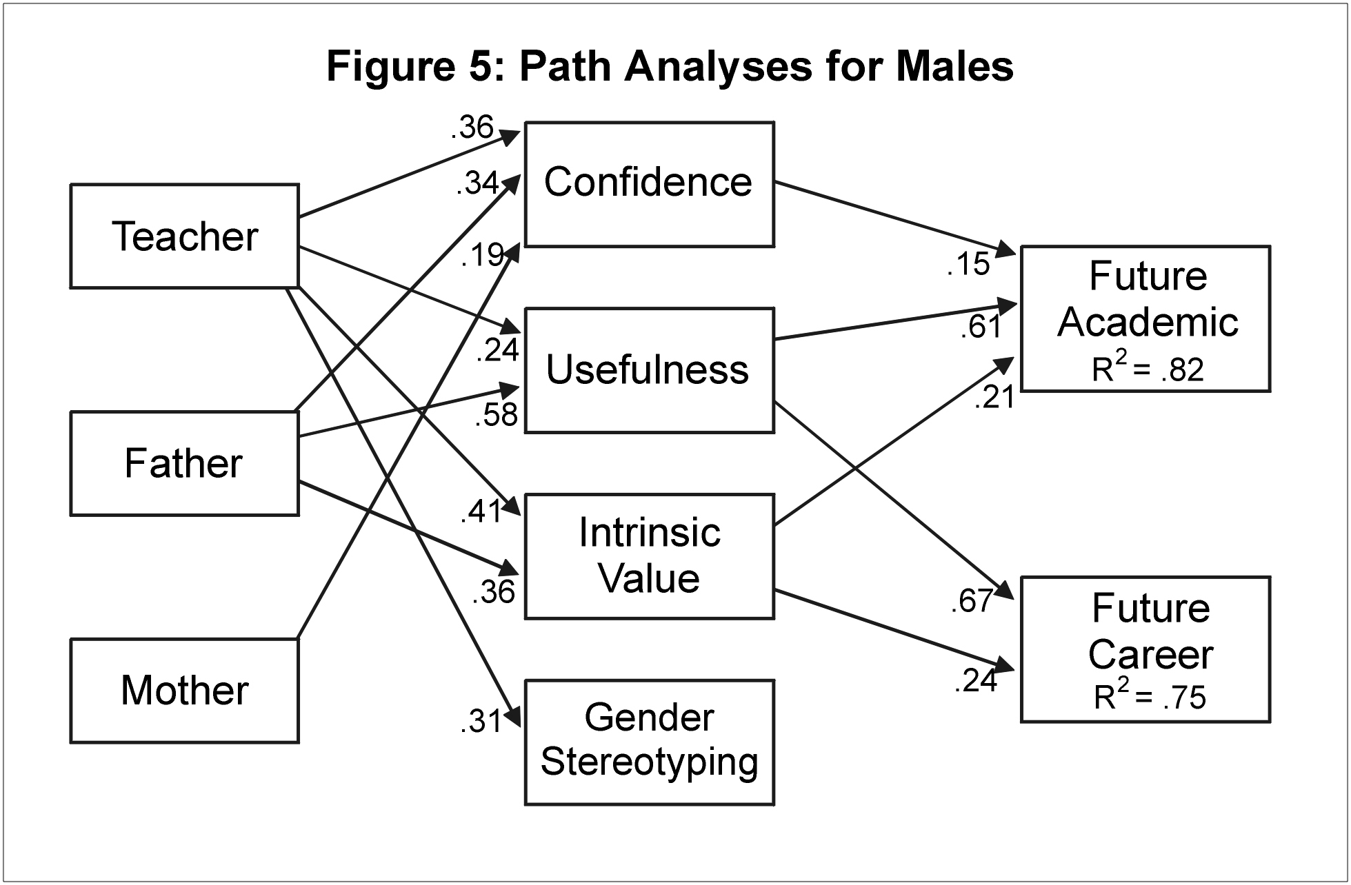 For boys, there are some similarities and differences in the pattern of results (see Figure 5). The predictive power of teacher support is lower for boys, relative to the results we found for girls. However, father support is quite predictive of boys' perceptions of the usefulness of computer science and computer-related activities. Furthermore, it is usefulness (i.e., utility value), rather than intrinsic value, which is the strongest predictor of boys' future intentions.